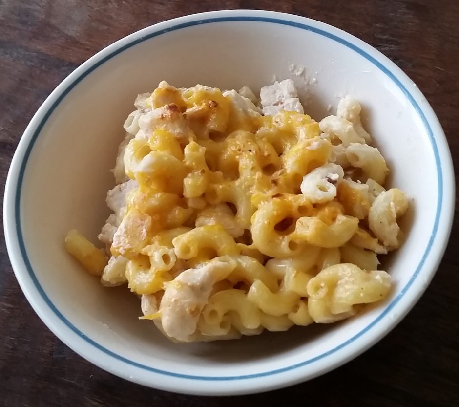 Cook macaroni and set aside. Fry chicken in olive oil till cooked through with 1/2 teaspoon of salt sprinkled over and set aside. Add 1 cup of the half and half cream, the chipotle peppers, and the garlic cloves to a food processor or blender and process till chipotle is blended. Add this to pan on medium high heat along with remaining 2 cups of half and half and the 1 cup of 2% milk. Mix the cornstarch with the water and add to the pan then add in the pepper, salt, onion powder, and red pepper flakes. Heat till it boils stirring constantly, then turn heat to low and gradually add in the Monterey and Pepper Jack cheeses gradually, continuing to stir until it is integrated. Now add in the chicken, continuing to stir, then add in the macaroni and stir till mixed. You can serve it like this or put it in a 9×13 baking pan, sprinkle with the shredded cheddar and put under the broiler to melt it and slightly brown the top of the mac and cheese.