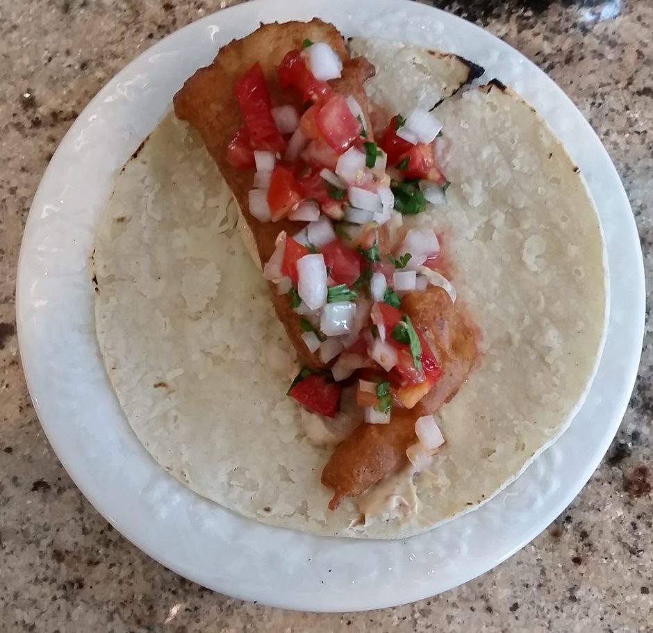 Prepare sauce by chopping chipotle finely and mixing with mayonnaise and 1/2 teaspoon of garlic powder. Prepare pico de gallo if desired by chopping and combining pico de gallo ingredients. Combine flour, garlic powder, paprika, salt, black pepper, egg, beer in a bowl and mix till smooth. Spay each tortilla with a little cooking oil and lightly fry in a hot pan for about 1-2 mins per side and set aside. Add oil to pan and heat to about 350 degrees. Dip fish strips into batter and fry for about 5 mins or till done turning over once. Put a layer of the chipotle sauce on the tortilla, then the fish and finally toppings. Fold over, serve and enjoy.