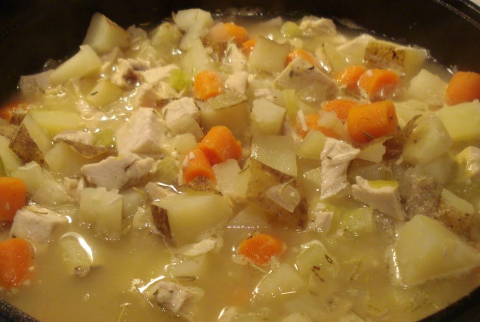 Add butter into pan over medium high heat, then add olive oil. When hot add garlic and lightly fry (don’t brown). Add in carrots, celery and onions and fry about 1 minutes more. Add in flour and stir and fry for another 2 minutes. then add in chicken broth slowly stiring and mixing with rue until smooth. Add potatoes, turkey,  about half the salt, sage, curry powder and black pepper. Cook until vegetables are tender. Add as much additional salt until seasoned to your preference. Serve and enjoy.