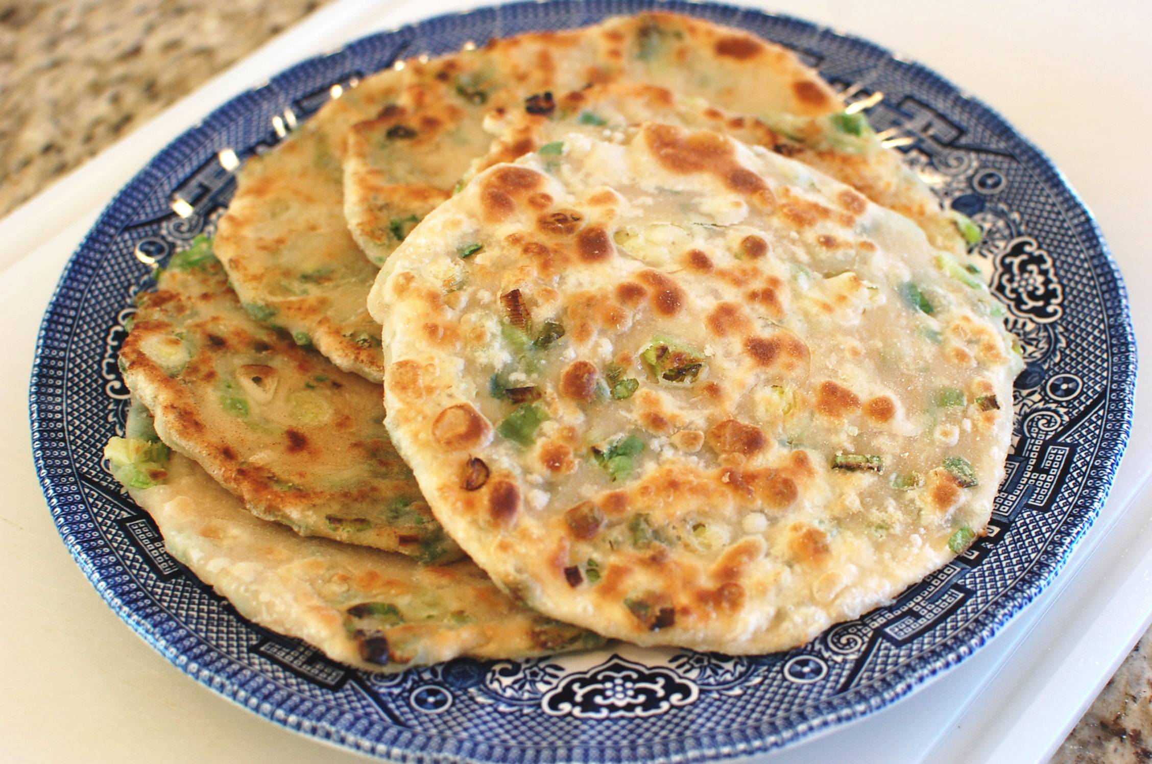 Put Flour and Salt into a bowl and mix dry ingredients. Add boiling water and stir and mix together with fork till dough comes together. Separate into 3 balls and let rest for 30 mins. Roll out balls into disks and sprinkle 1/3 of the green onions on each. Roll up into a cigar shape with onions inside, then coil up cigar into a disk. Then roll out into a pancake and fry each pancake in 1 tablespoon of oil over medium high heat till browned and cooked.